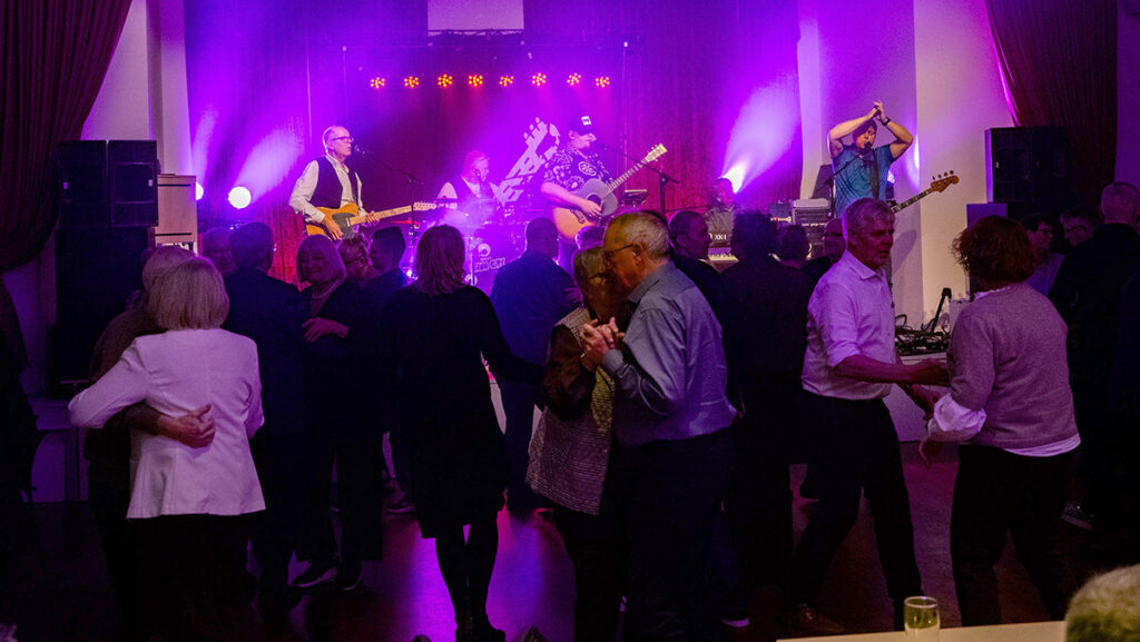Der var knald på fra starten. Ikke så snart havde det første klimperi lydt, før dansegulvet blev indtaget. Den fire mand store besætning med guitar, trommer, keyboard og bas blev snart suppleret med Jonas – bandets frontfigur, som i 2024 via X-factor havde lært noget stemmestyring fra sin mentor, Simon Kvamm. Med sådan en kraftfuld stemme, så ligger de stadigvæk i Dronninglund og kan ikke forstå, hvad det var, der ramte dem. Han synger flot, og selvsagt meget kraftfuldt, den gode Jonas.
