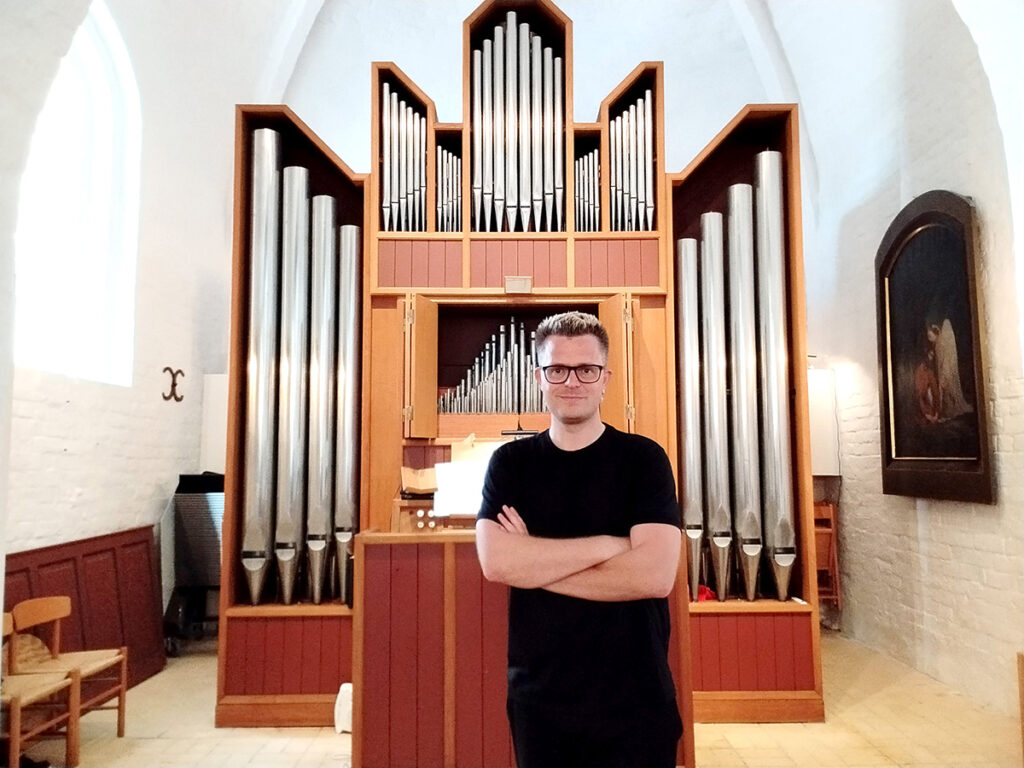 Midt i januar spiller organist Lasse Christensen en lille aftenkoncert efter skumringen med musik fra den svenske folketone på orglet i Hellevad Kirke i Klokkerholm.